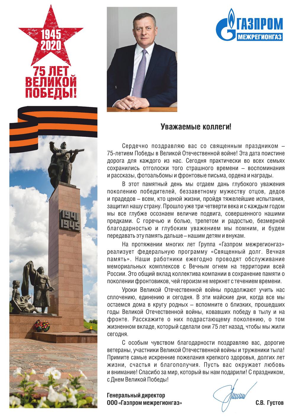 Сегодня, 9 мая 2020 года, в честь 75-летия Победы в Великой Отечественной войне генеральный директор ООО «Газпром межрегионгаз» Сергей Густов и профильные руководители компании возложили цветы к братской могиле на территории воинского мемориального комплекса «Павшим» под Санкт-Петербургом.