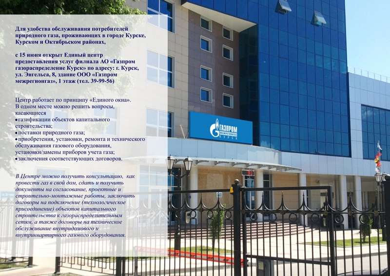 С целью удобства предоставления совместных услуг для населения ООО «Газпром межрегионгаз Курск» и АО «Газпром газораспределение Курск» вновь организован Единый центр предоставления услуг филиала АО «Газпром газораспределение Курск» в г. Курске (тел. 39-9956), который с 15.06.2020 года будет обслуживать г. Курск, Курский и Октябрьский район и размещаться по адресу: г. Курск, ул. Энгельса, 8.